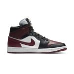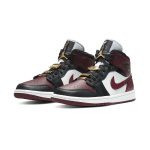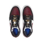 The women’s Air Jordan 1 Mid SE ‘Gold Pendants’ enlivens the classic silhouette with metallic gold hardware. The decorative pieces take the form of a gold Jumpman pendant and various matching gold lace jewels, including the familiar Wings logo and rectangular plates stamped with ‘1985’ and ‘Women.’ The shoe itself features a full leather build, highlighted by white and burgundy paneling with contrasting black overlays along the toe and eyestay. A royal blue Jumpman adorns the woven tongue tag.