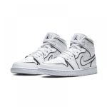 The Women’s Air Jordan 1 Mid “Iridescent Outline” is a women’s-exclusive edition of the mid-top Jordan 1 with a unique “outlined” construction. The upper is composed of a white leather base and features detailing in the form of a perforated toe, embossed tonal Wings logo on the collar and Swoosh on the mid-panel. Iridescent trimming is seen around each panel in a reflective material that changes color when hit with light. The rest of the women’s-exclusive Air Jordan 1 Mid, including the tongue, midsole, and outsole, is finished off in crisp white.
